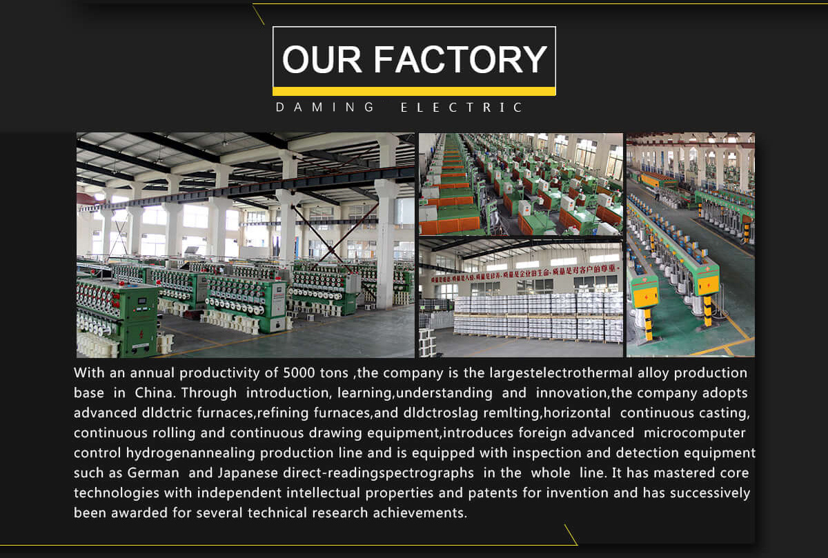 Productos principales:Alambre calefactor, alambre de resistencia, alambre de nicromo, alambre de hierro cromo aluminio, alambre de acero inoxidable